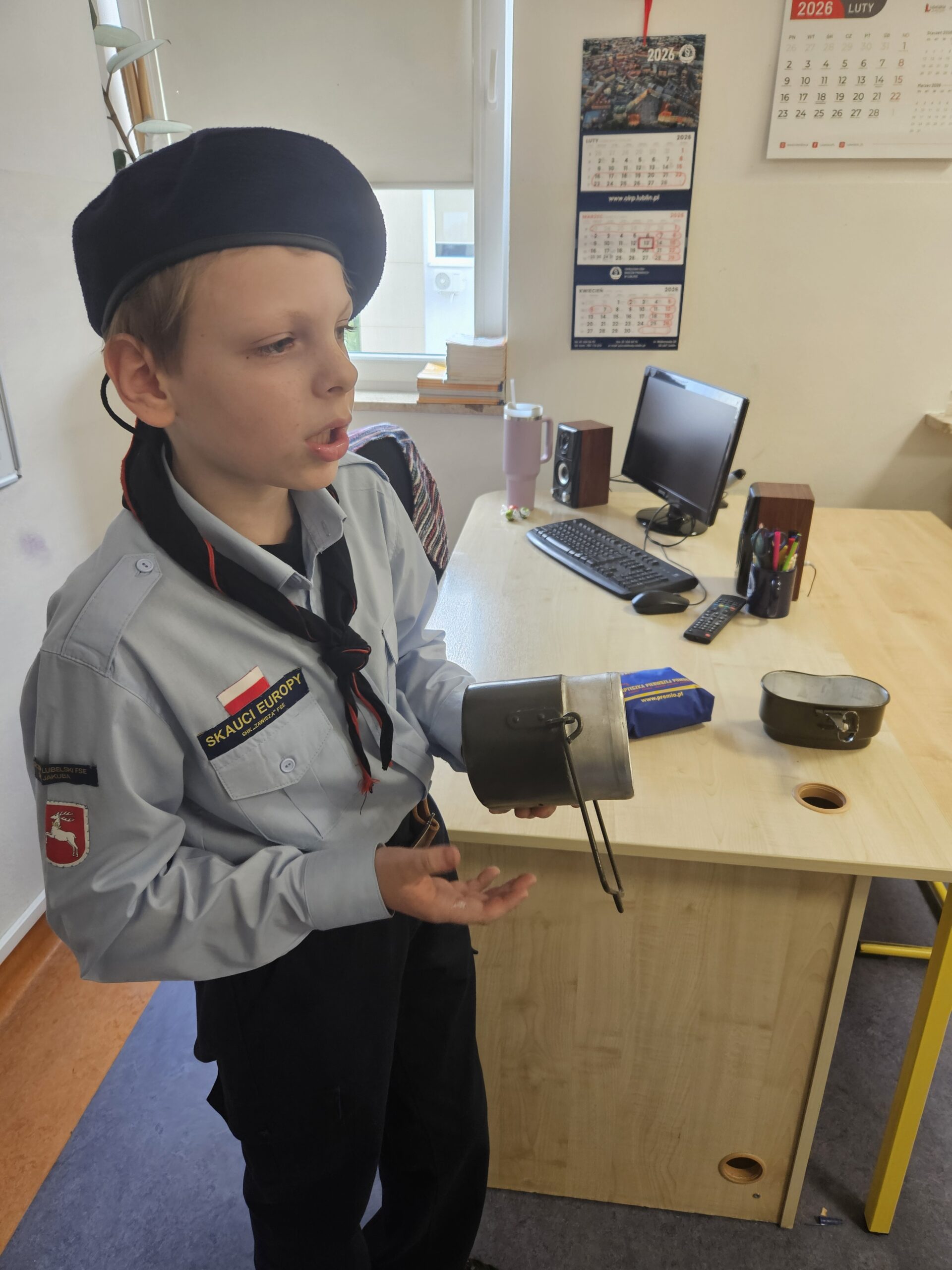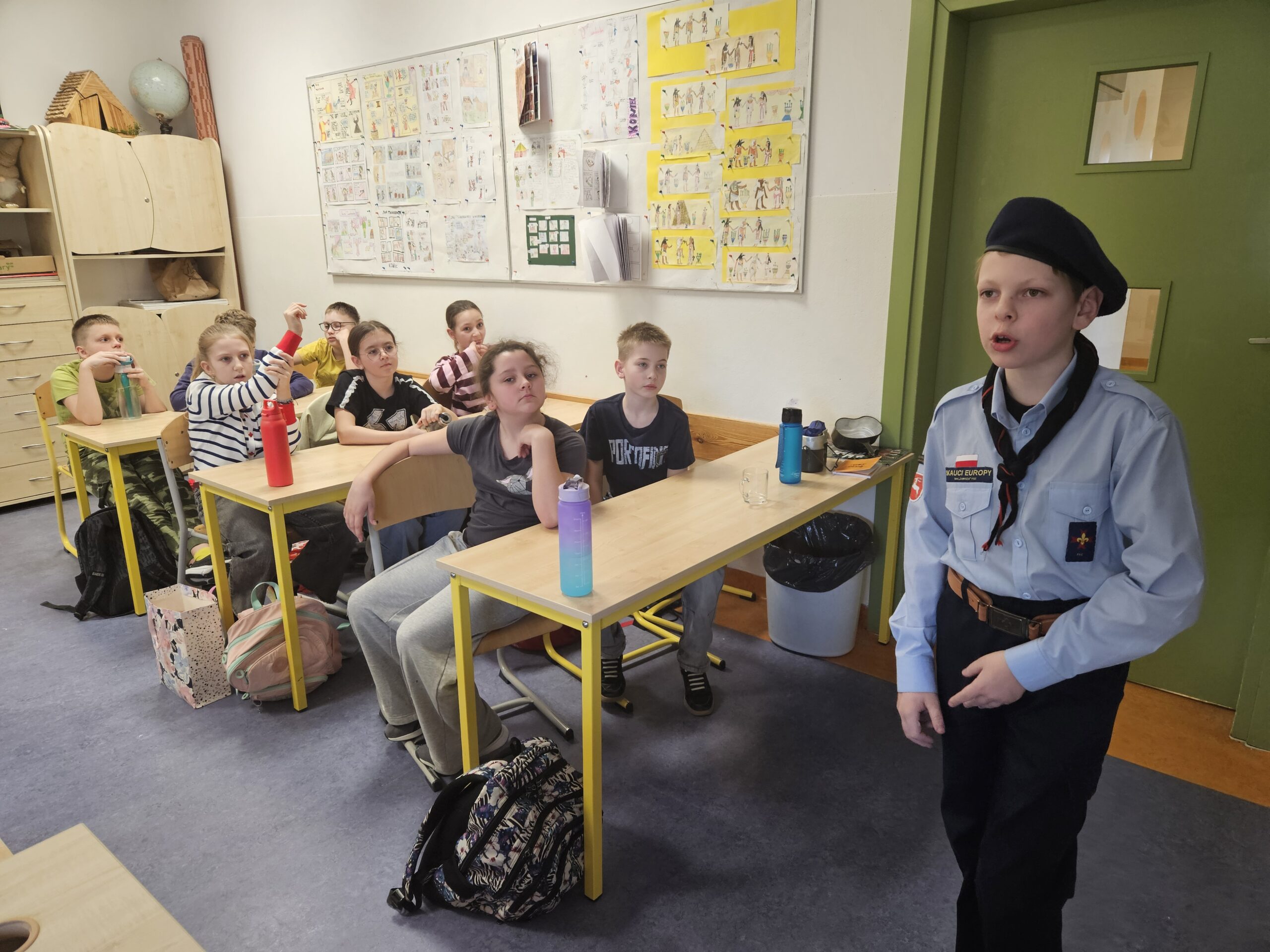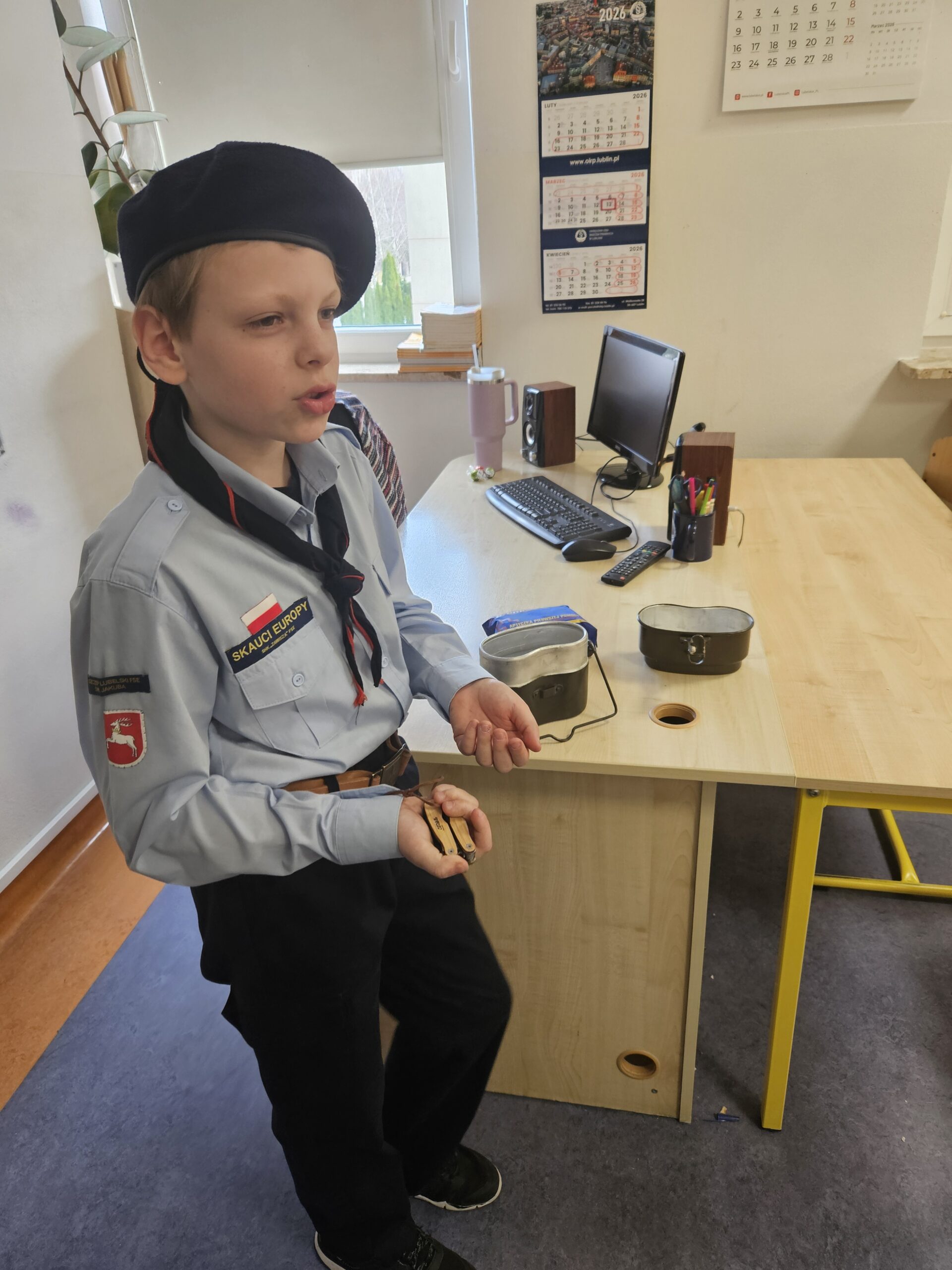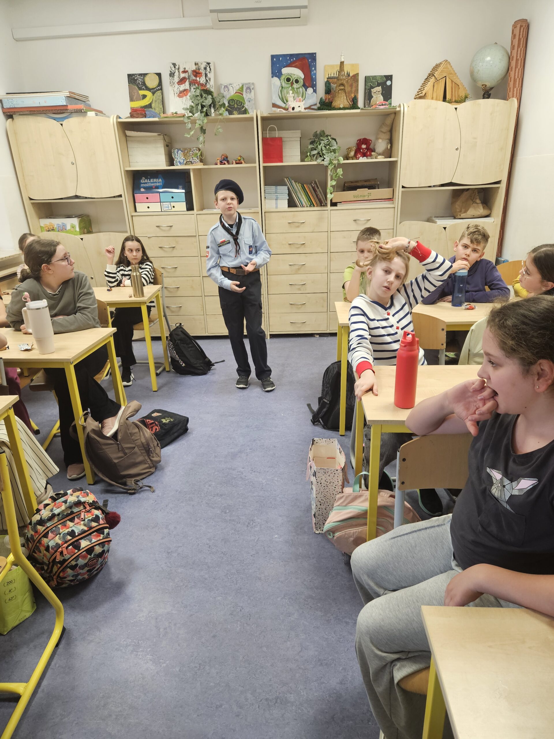 12.03 na lekcji wychowawczej Adam Dzięcioł, uczeń kl.4a prezentował swoją wielką pasję do harcerstwa. Opowiadał jak to się stało, że trafił do takiej organizacji, co robi podczas spotkań, czy wyjazdów, prezentował mundur, menaszkę, inne sprzęty i wyposażenie harcerza. Opowiadał o zasadach, dyscyplinie, ale również checi niesienia pomocy i dobrej zabawie.