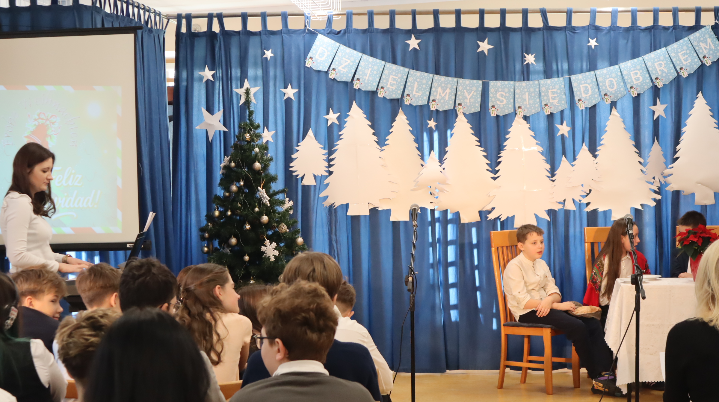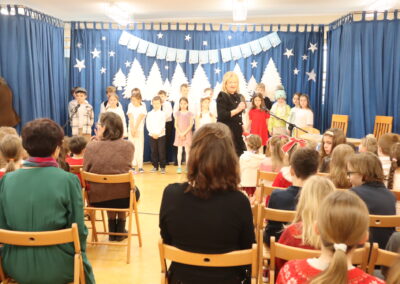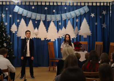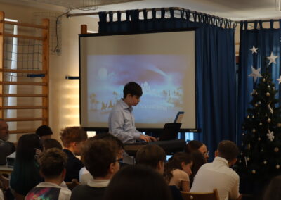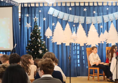 Uczniowie klas 4-8 obejrzeli prezentację przygotowaną przez zespół z klas 4, 5, 7 i 8 oraz szkolny chór. Prezentacja przybliżyła nam sens dobrze znanych świątecznych symboli i ich chrześcijańskie źródło. Dowiedzieliśmy się, jak obchodzi się Boże Narodzenie w różnych europejskich krajach. Uczniowie zostali przygotowani przez panią Marię Chaciołkę, panią Katarzynę Forysiuk, panią Marię Dudzińską-Karkut, panią Alicję Porzak i panią Karolinę Węcławik.