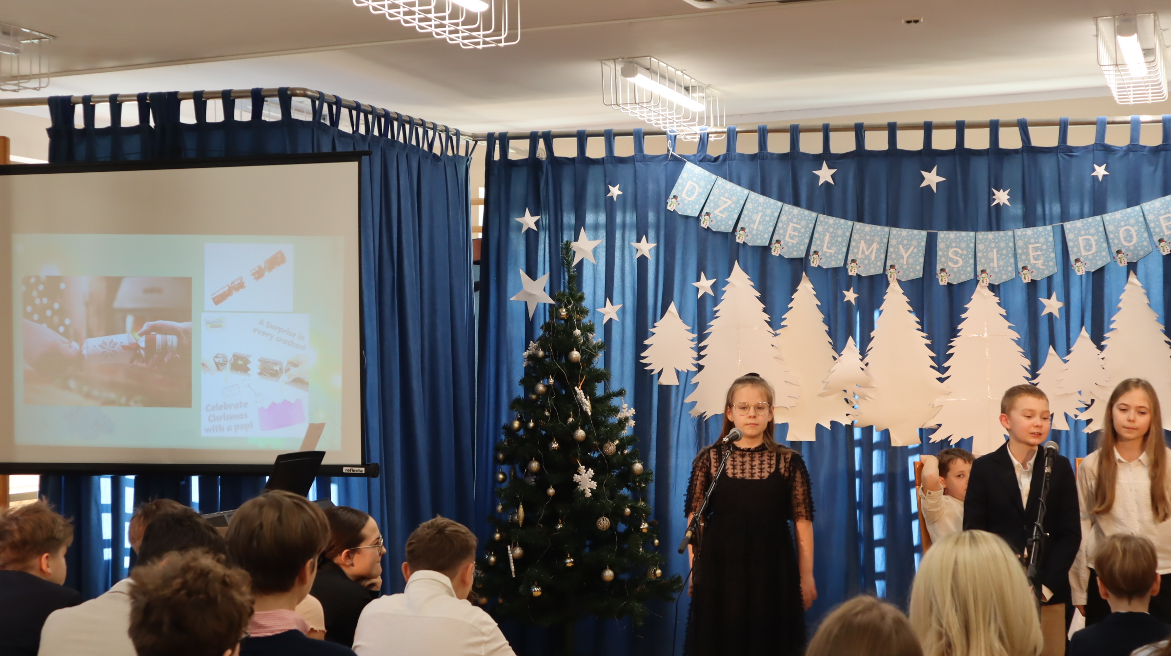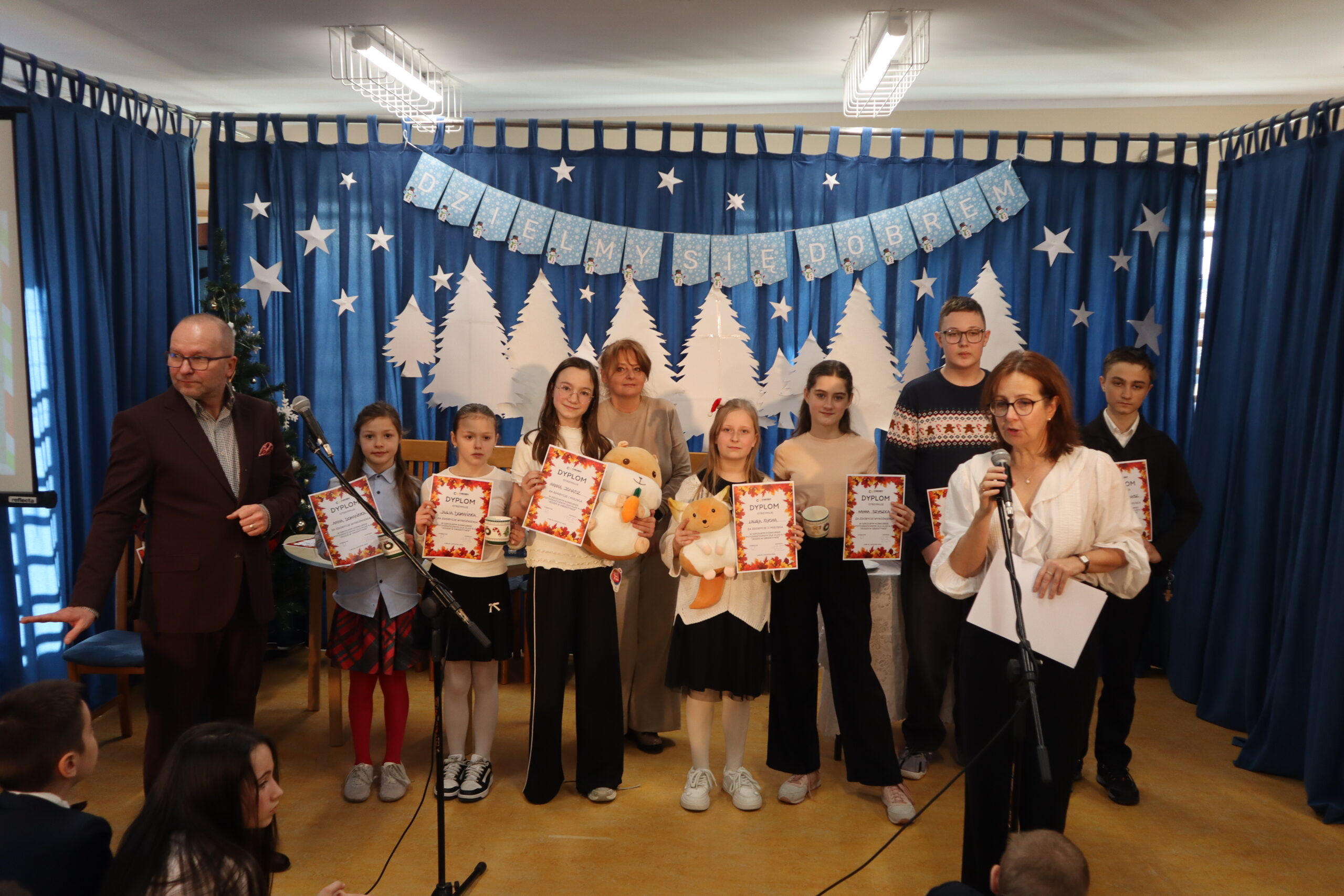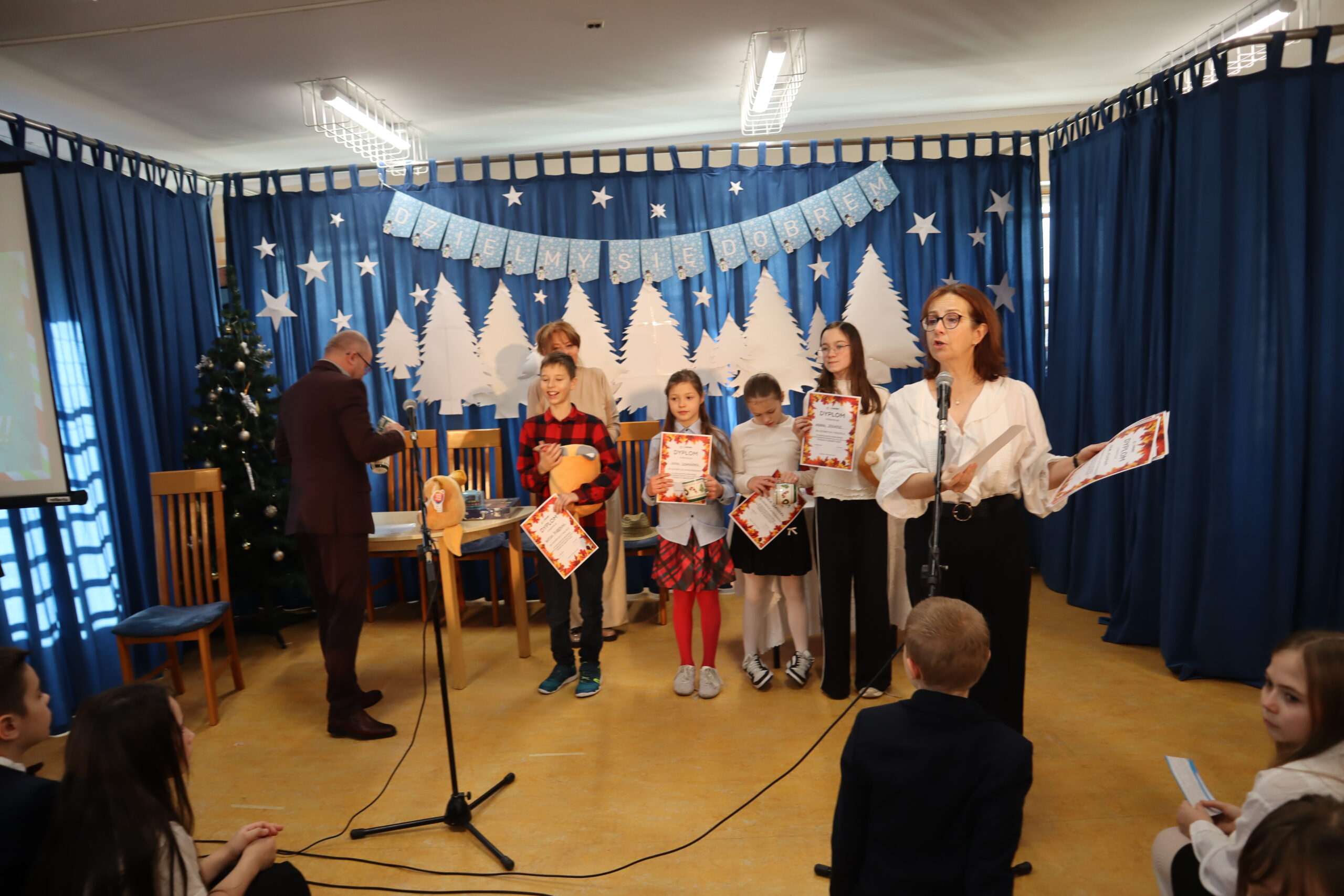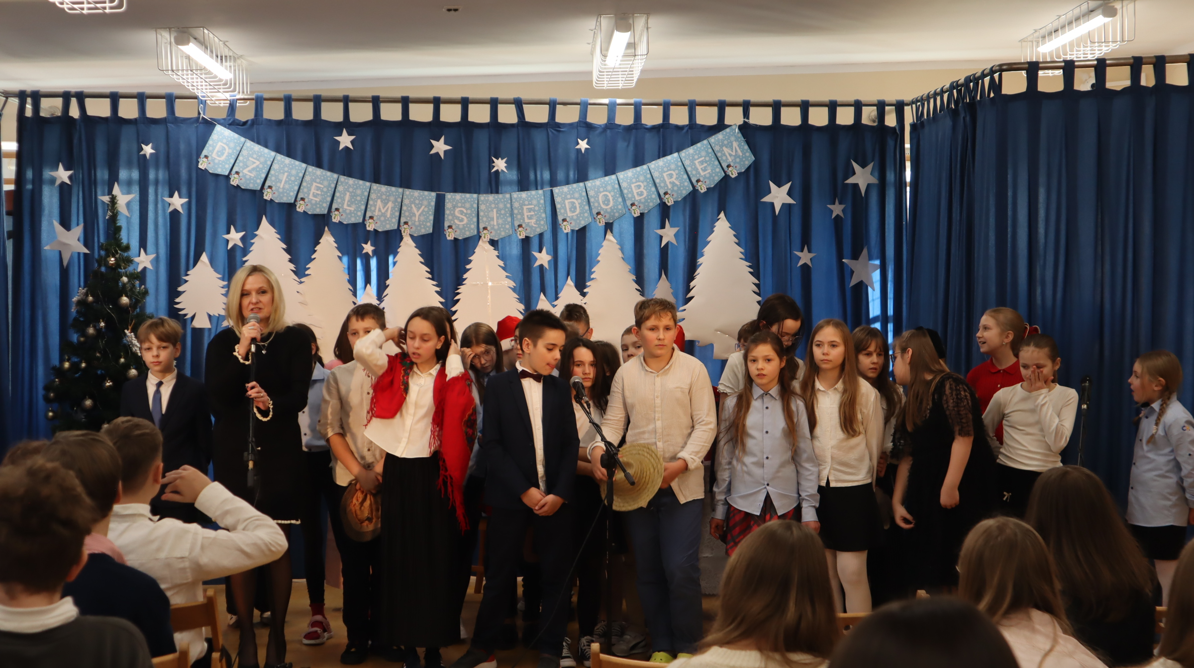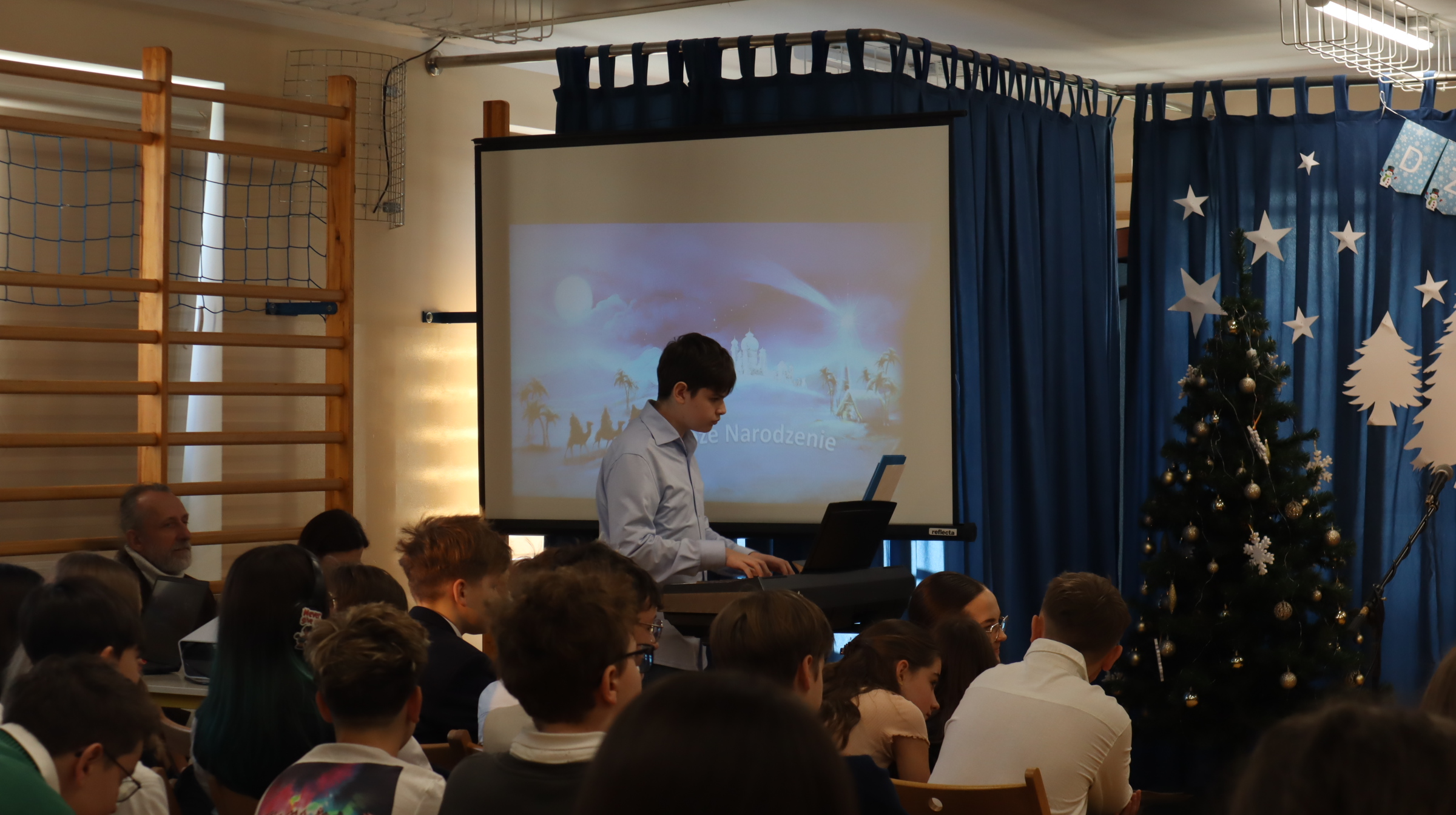 19 grudnia 2025 r. wszyscy uczniowie wraz z nauczycielami spotkali się w sali gimnastycznej, aby świętować zbliżające się Boże Narodzenie.