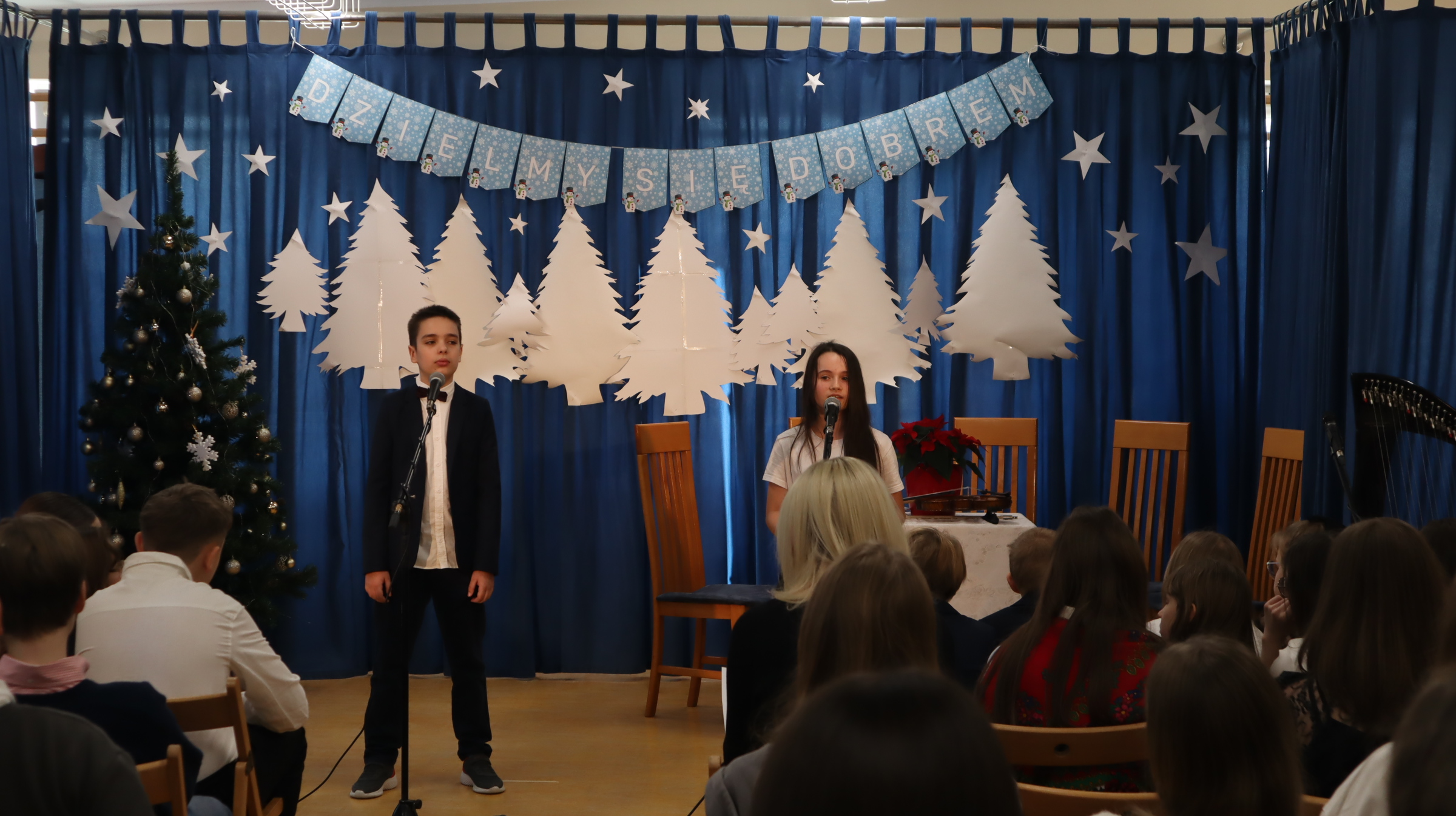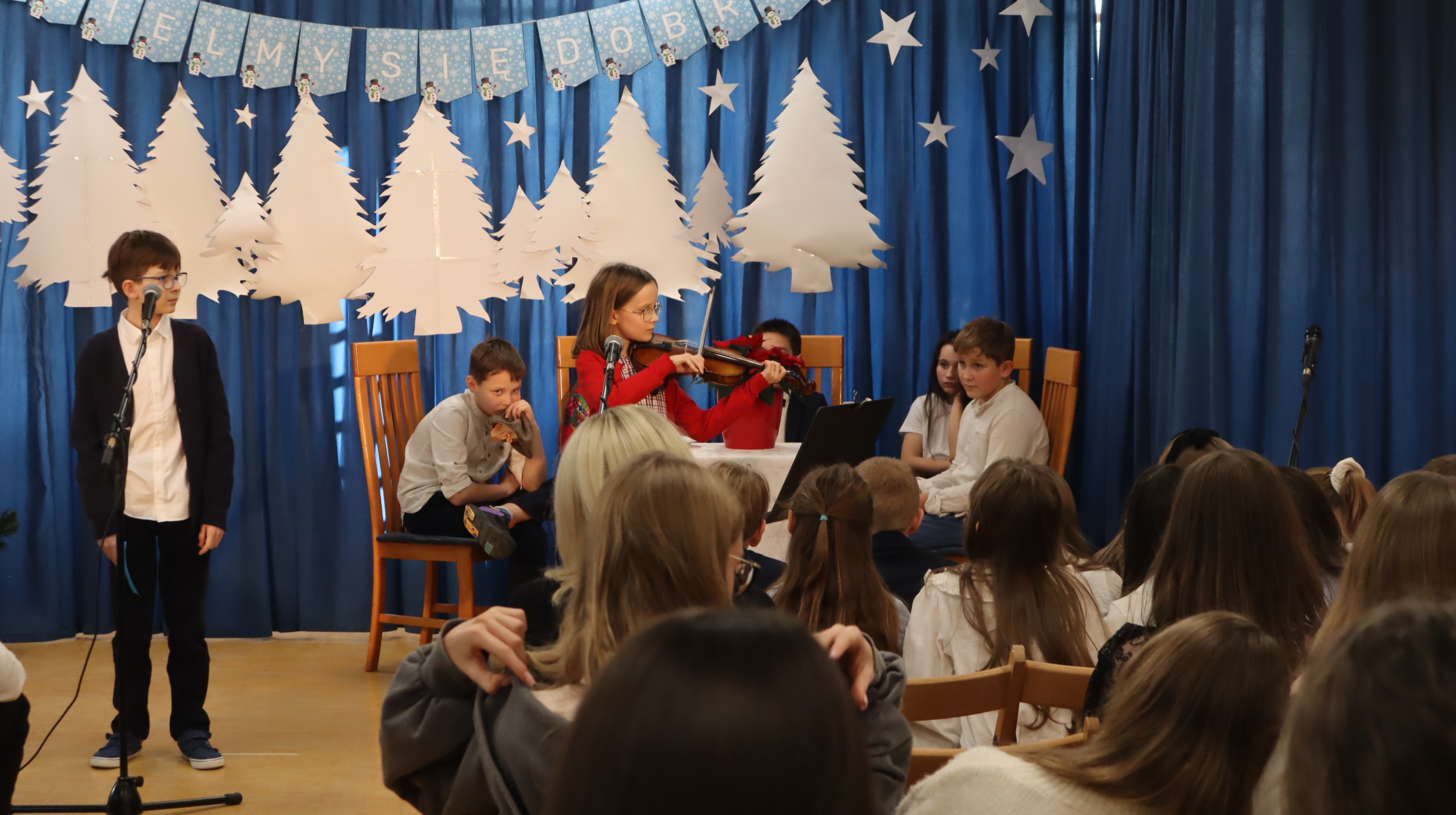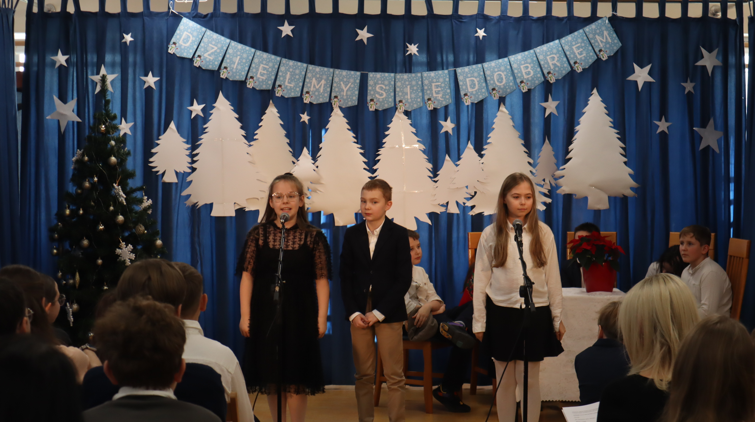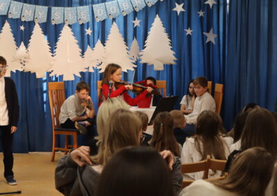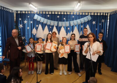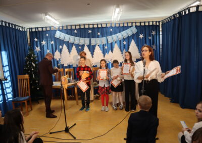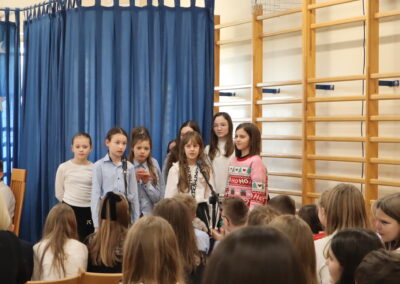 Uczniowie klas 1-3 obejrzeli widowisko przygotowane przez kolegów z klas 3b i 3c pod opieką pani Ewy Rzechowskiej i pani Anny Siatki. Poznali historię chłopca, który obdarowany świątecznymi prezentami, pomaga nam zrozumieć, jak stawać się dobrym. Chór szkolny pod kierownictwem pana Jarosława Agacińskiego zaśpiewał kolędę i pastorałkę ubogaconą o zwrotki związane ze społecznością naszej szkoły.