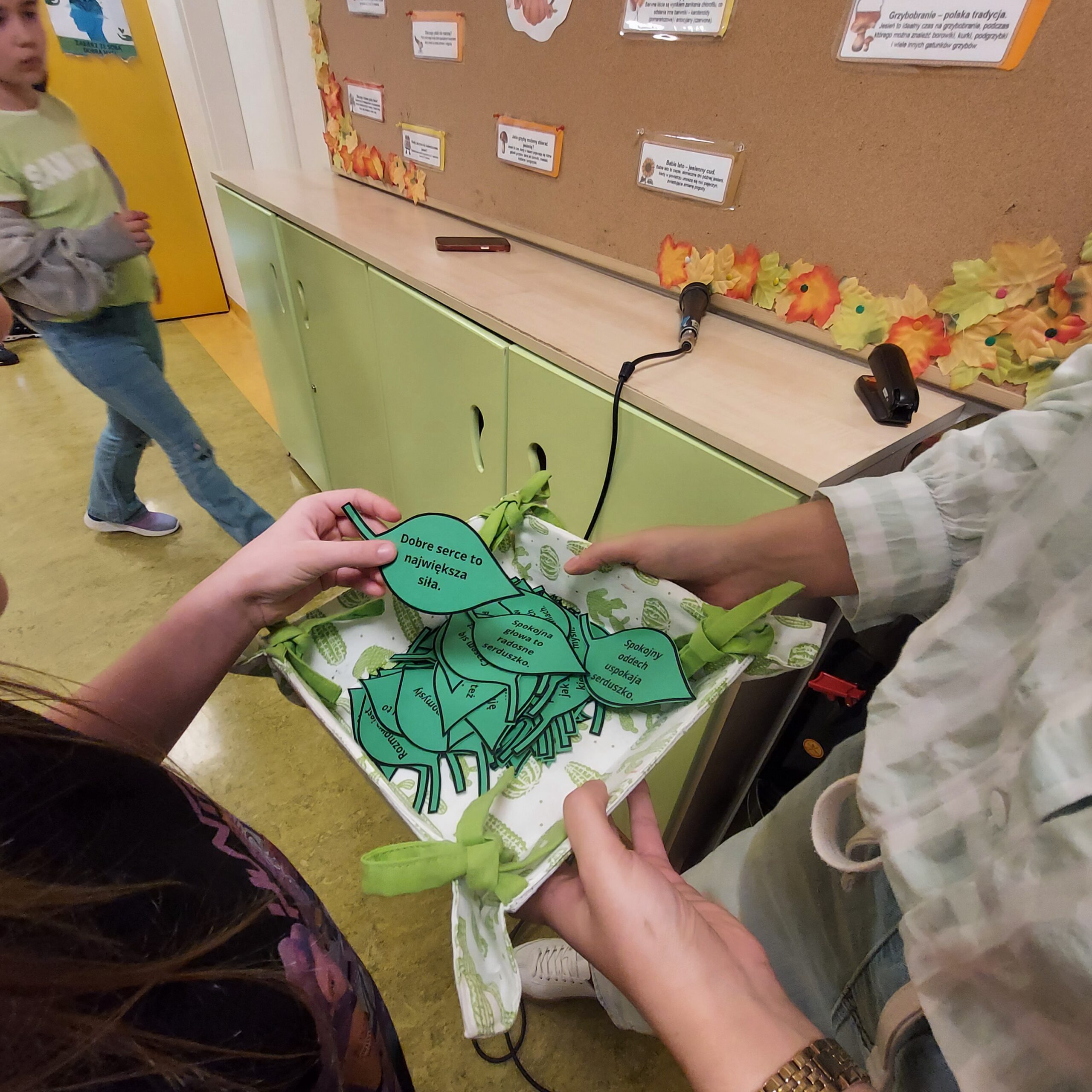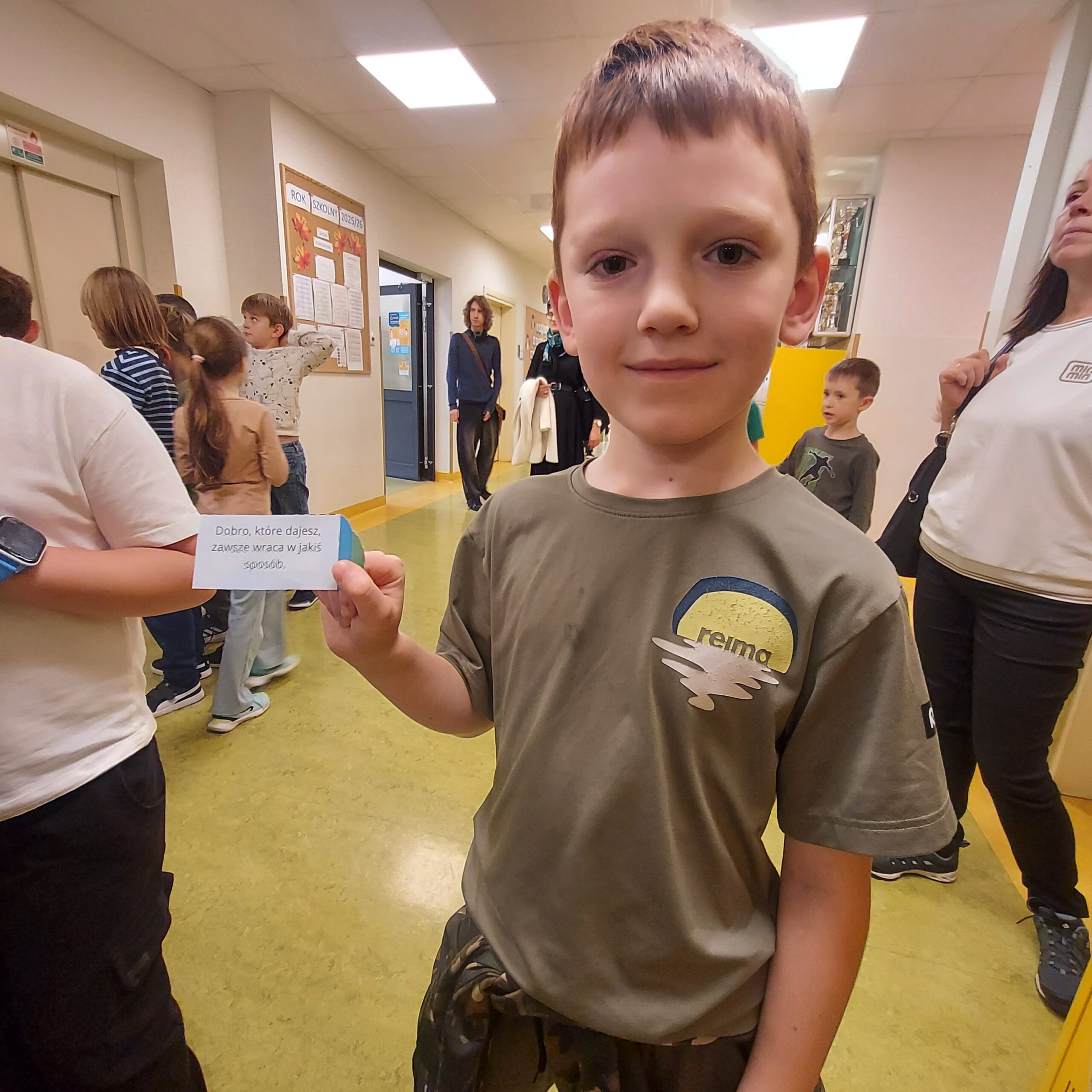 Natomiast uczniowie klas 4–8 mogli wziąć udział w „słoiku wyzwań”, z którego losowali zadania promujące dobro, życzliwość i troskę o siebie nawzajem.