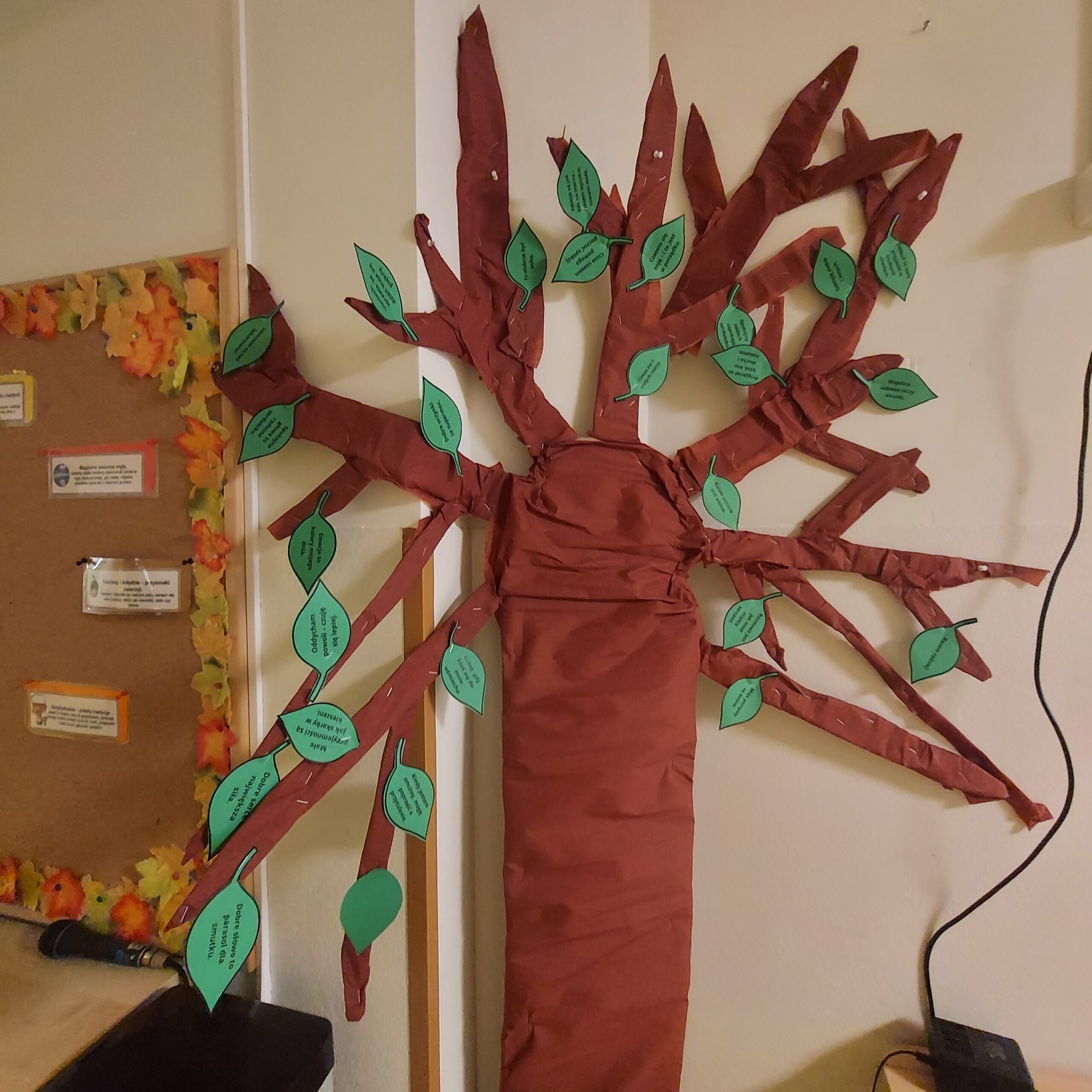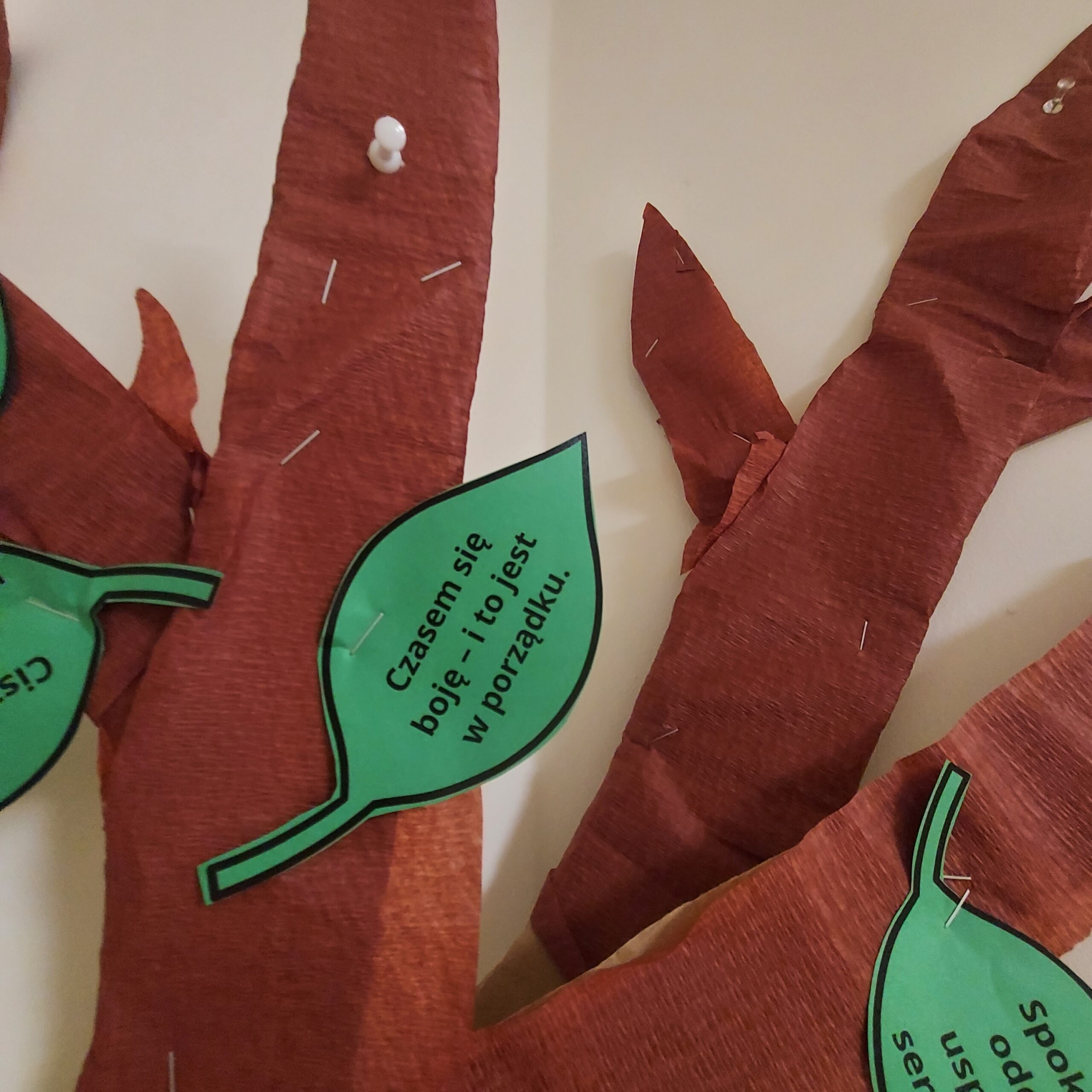 Uczniowie klas 1–3 wspólnie stworzyli „Drzewo Dobrych Myśli”, które rozkwitło pięknymi, wzmacniającymi słowami.