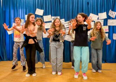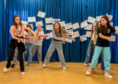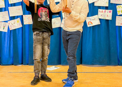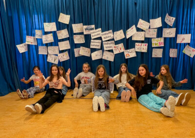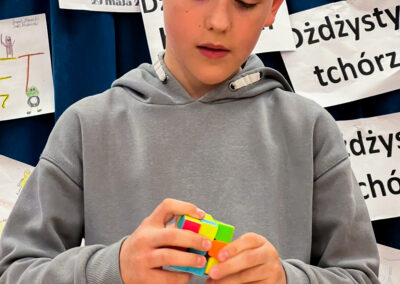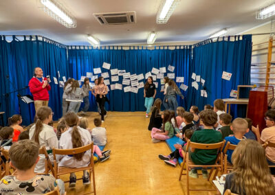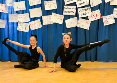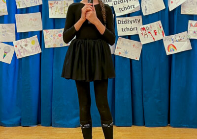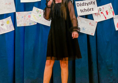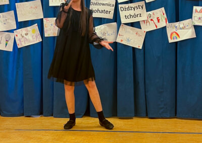 Mottem naszej zabawy były słowa zaczerpnięte z piosenki ułożonej przez pana Jarosława Agacińskiego na podstawie przypadkowych słów znajdujących się na stopniach naszej szkoły (1 i 2 piętro) „Dżdżysty tchórz”!