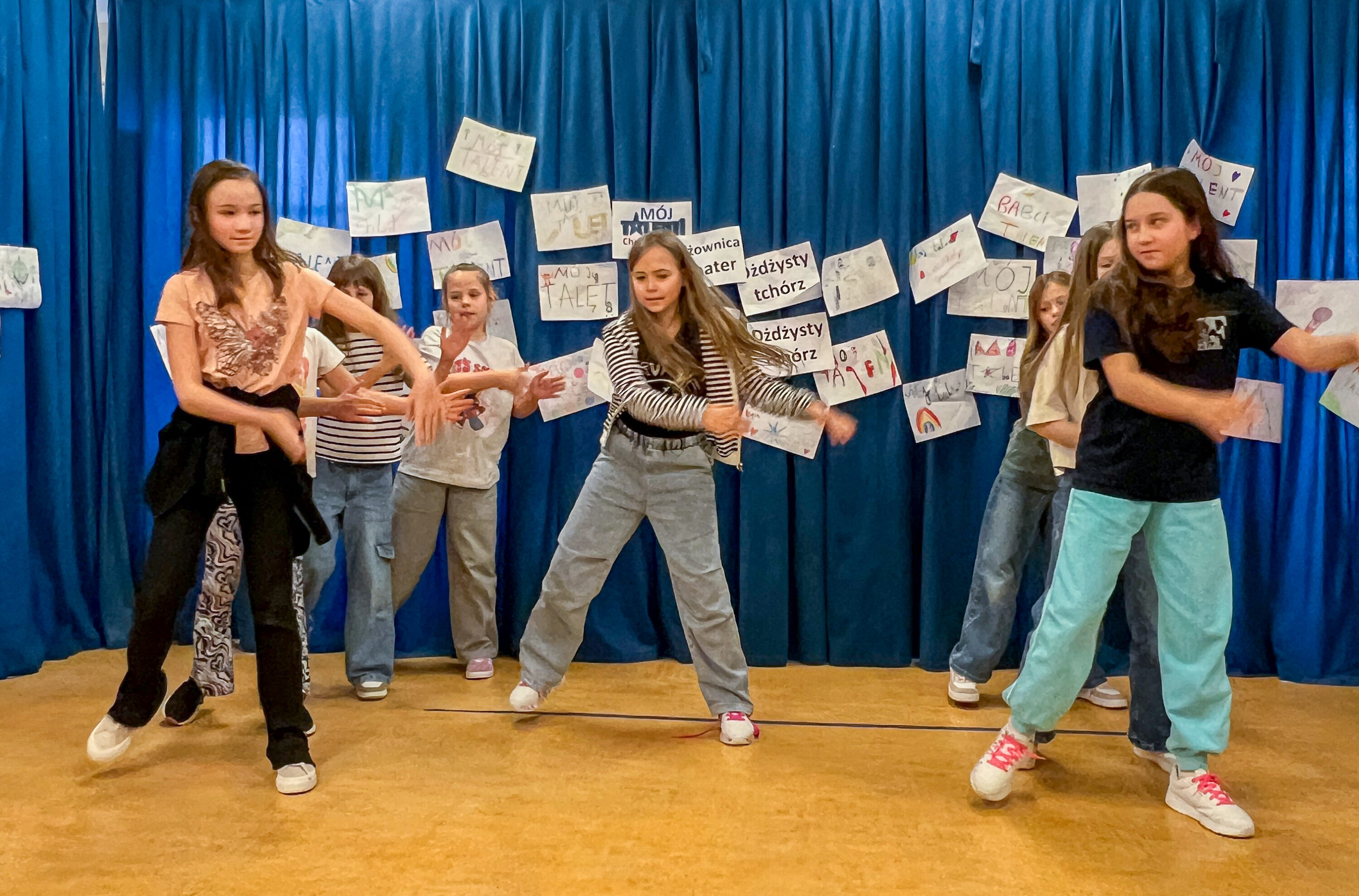 Mottem naszej zabawy były słowa zaczerpnięte z piosenki ułożonej przez pana Jarosława Agacińskiego na podstawie przypadkowych słów znajdujących się na stopniach naszej szkoły (1 i 2 piętro) „Dżdżysty tchórz”!