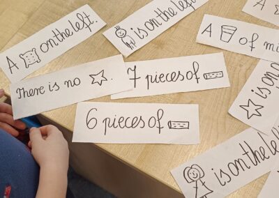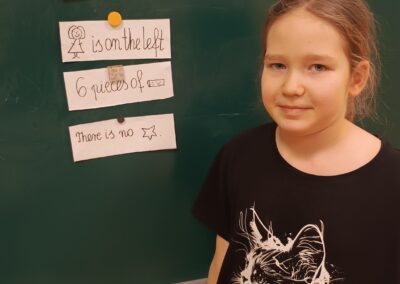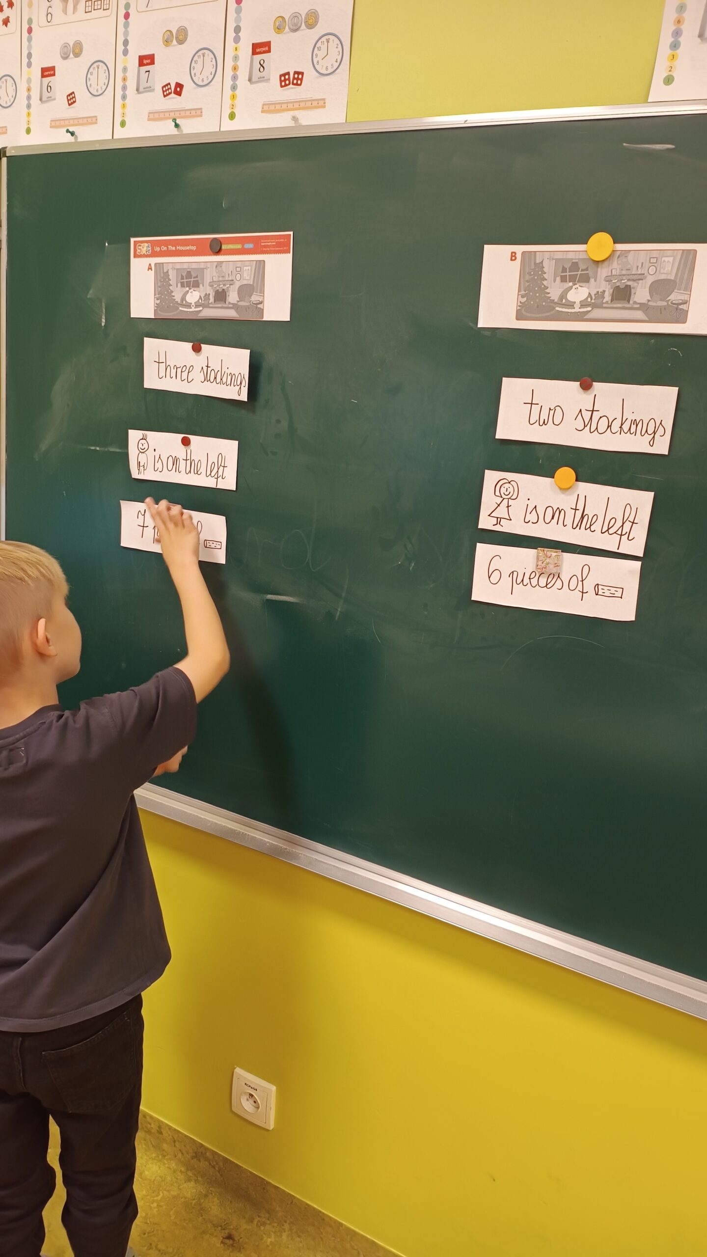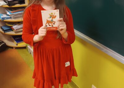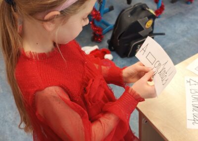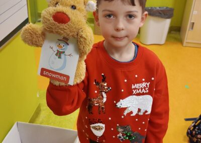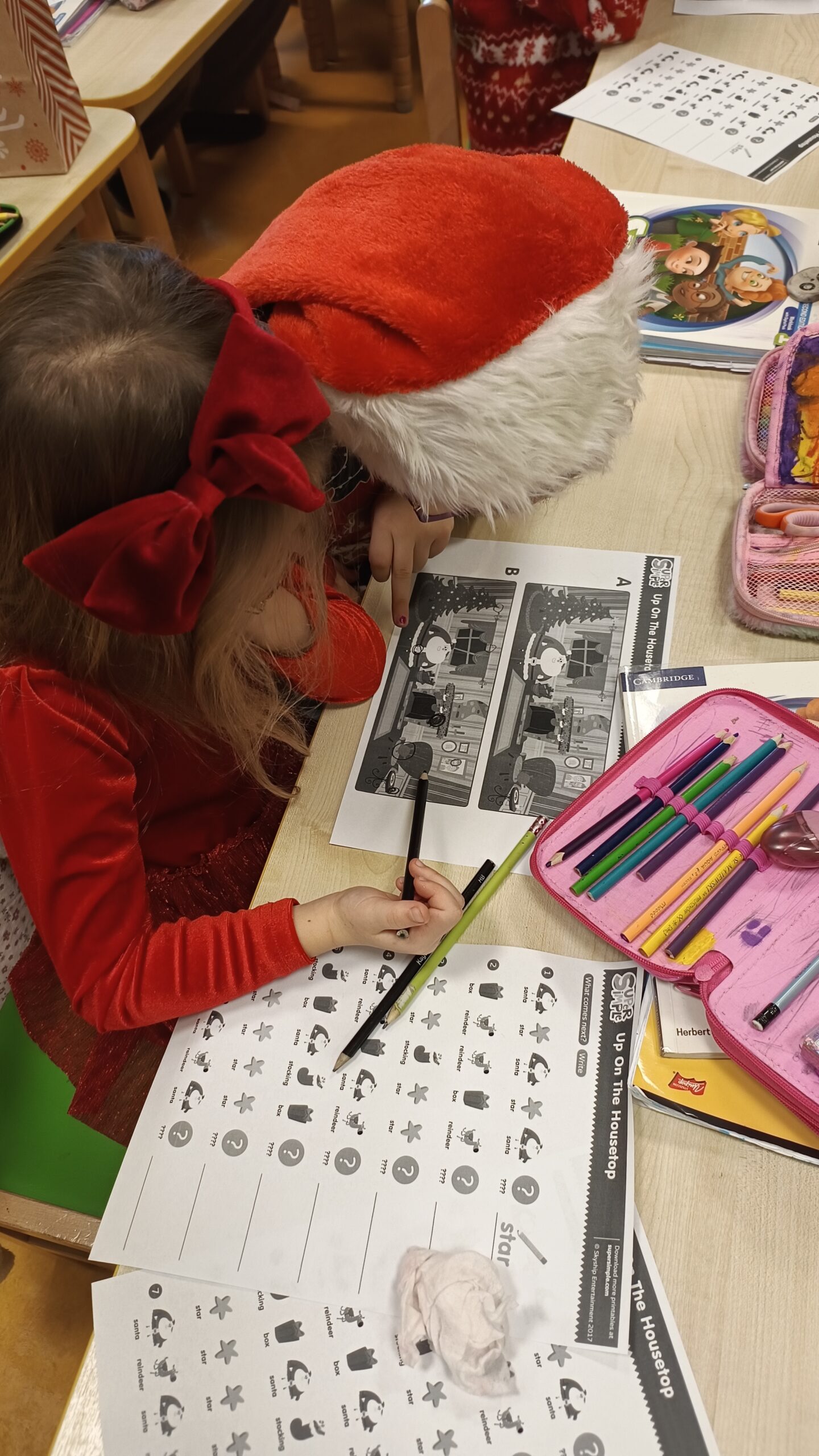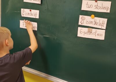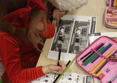 Podczas zajęć pierwszoklasiści poznali słownictwo do piosenki, rozwiązywali mikołajkowe zagadki, wyszukiwali i opisywali różnice na obrazkach, a następnie wspólnie zaśpiewali utwór „Up on the Housetop”. Taka forma pracy pomogła uczniom utrwalić pisownię wyrazów, ćwiczyć czytanie oraz budowanie prostych zdań w języku angielskim.