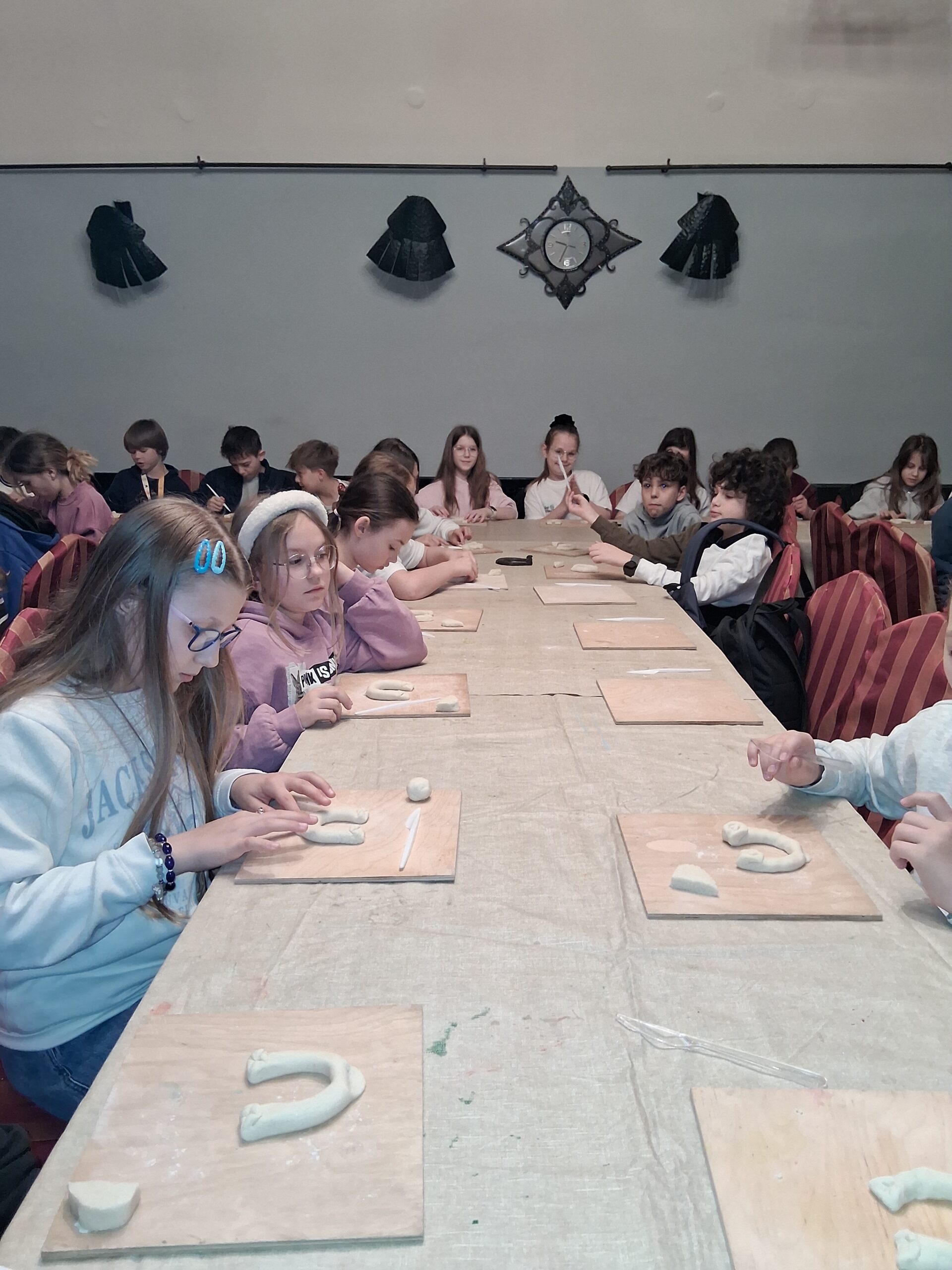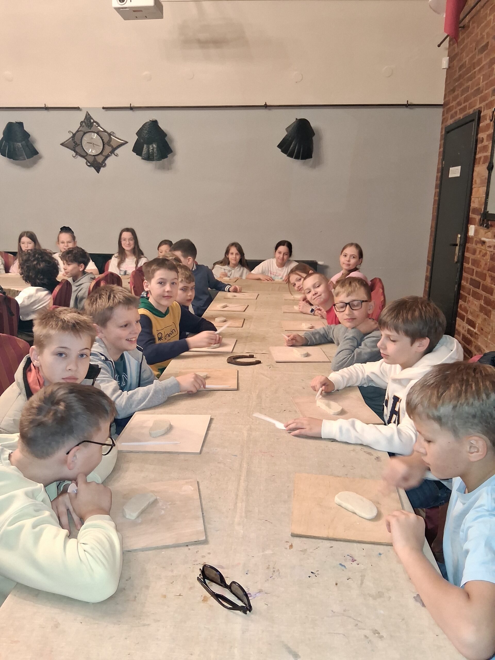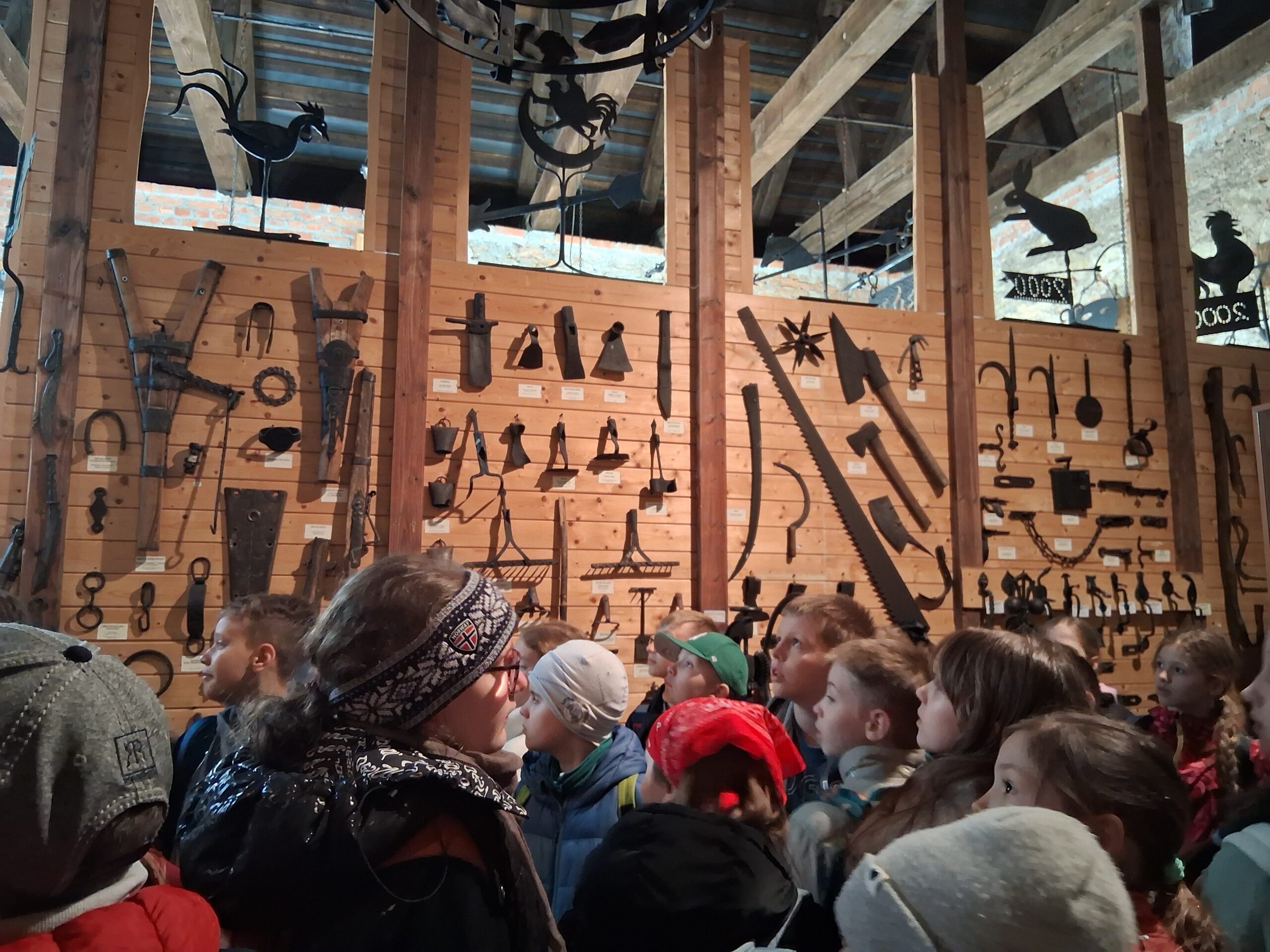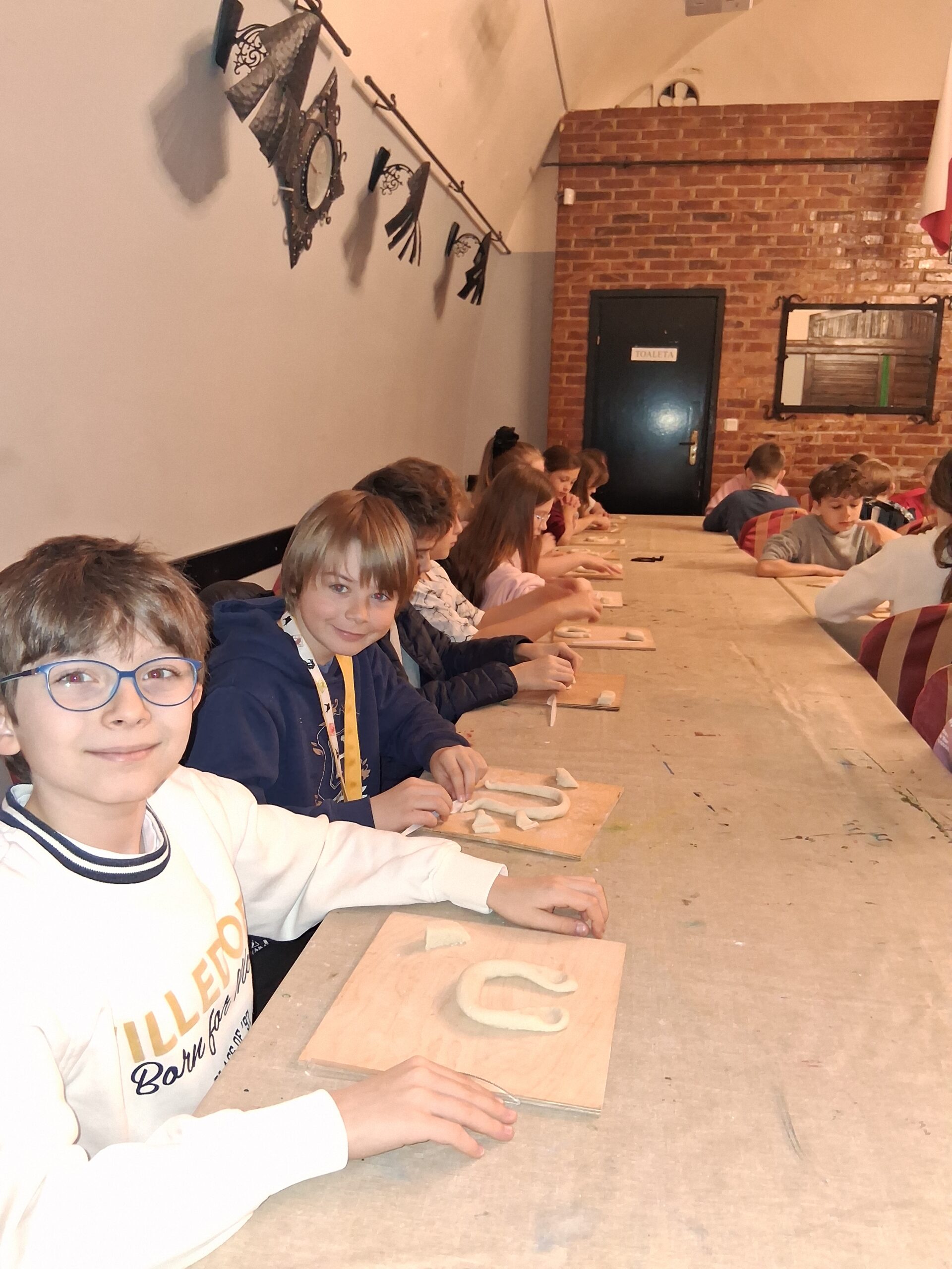 16 kwietnia klasy czwarte zwiedzały Muzeum Kowalstwa w Wieży Ariańskiej w Wojciechowie. Uczniowie podziwiali niezwykłe eksponaty wykute z żelaza, słuchali opowieści o pracy kowala, poznawali różne rodzaje podków oraz miejscowe legendy.  Szczególnie atrakcyjne okazały się warsztaty pt. 'Podkowa z masy solnej’, w czasie których czwartoklasiści formowali własne podkowy z masy solnej, ucząc się jak nadać im odpowiedni kształt. Wypieczone wyroby uczniowie zabrali ze sobą na pamiątkę i oczywiście na szczęście.