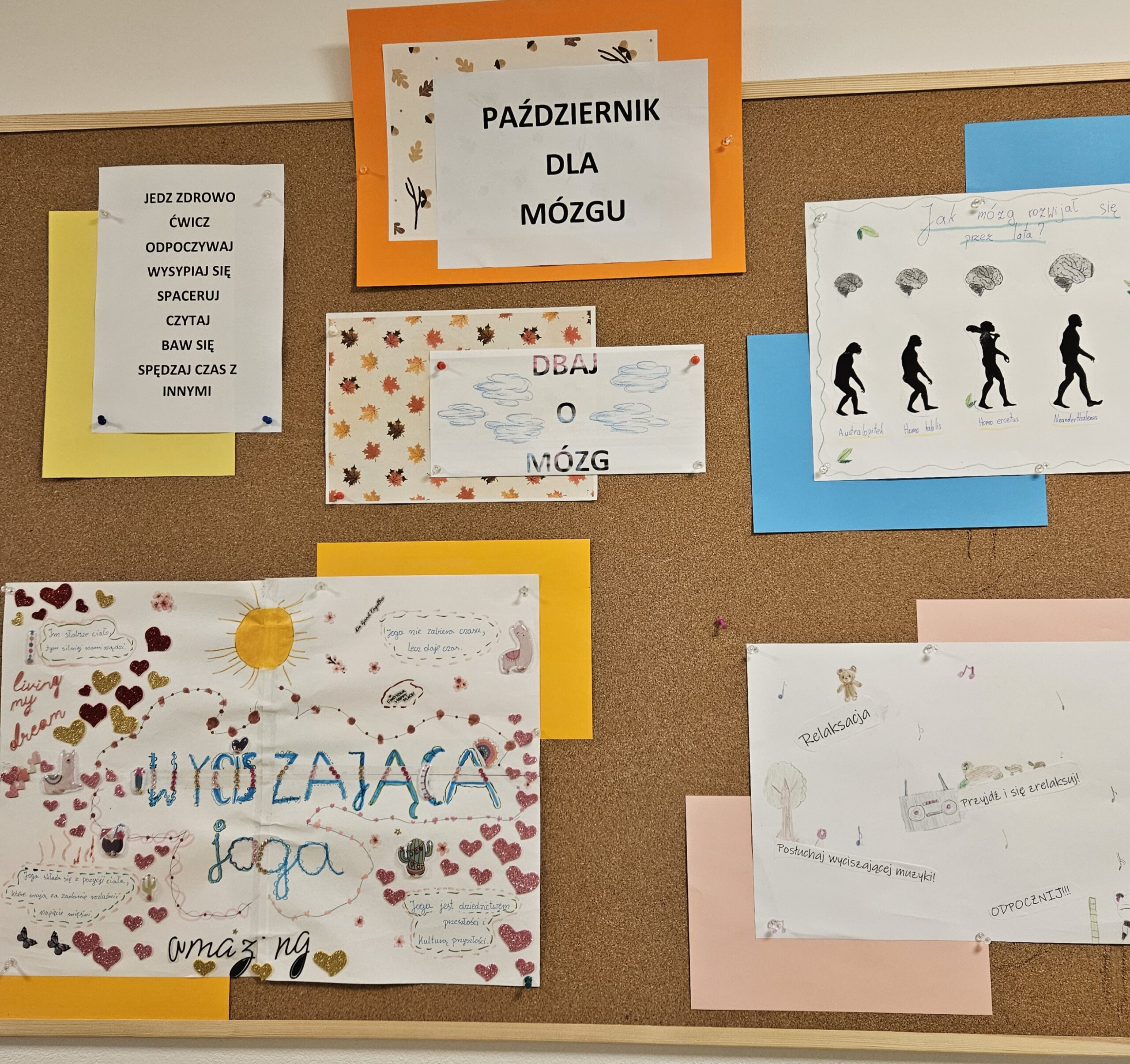 W październiku klasa 4a z wychowawczynią podejmuje różne akcje w ramach tematu Październik dla mózgu. Na korytarzu wywieszone są różne ciekawostki dotyczące mózgu, na wf odbywa się relaksacyjna joga, w strefie ciszy można odpocząć przy kojącej muzyce, a na śniadaniówkach serwowane są zdrowe dla mózgu potrawy. Dalsze aktywności niebawem.
