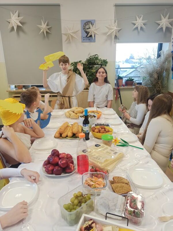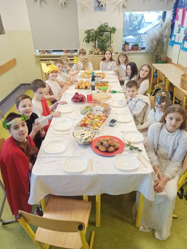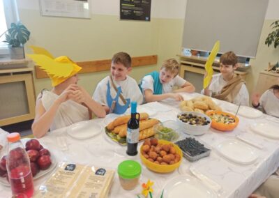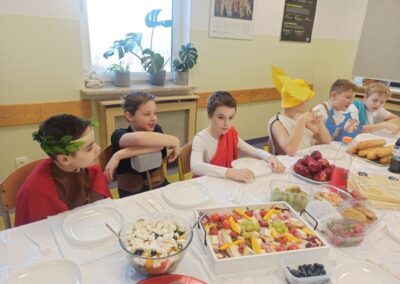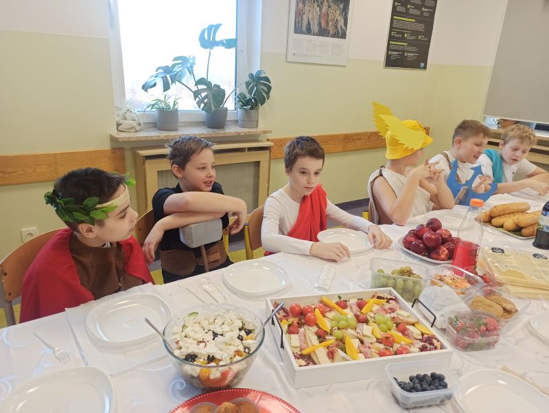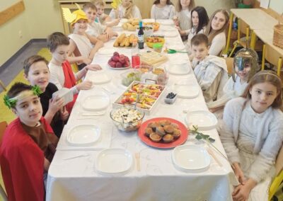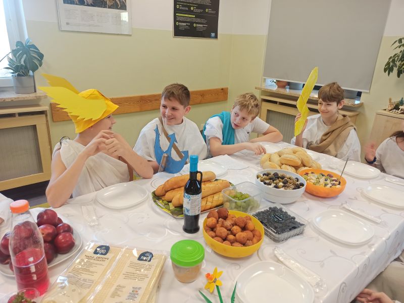 Czy szkolna lekcja może zamienić się w prawdziwe święto? W naszej szkole – zdecydowanie tak! Klasa 5a świętowała podsumowanie cyklu zajęć o mitologii greckiej oraz… setną lekcję języka polskiego w tym roku szkolnym w wyjątkowy sposób: podczas niezwykłej uczty na Olimpie.