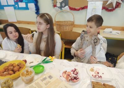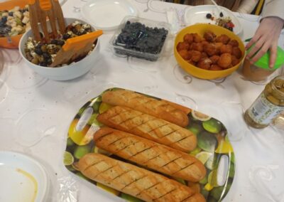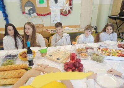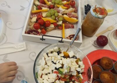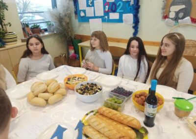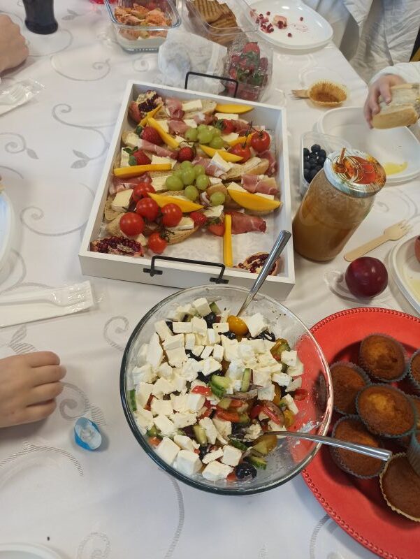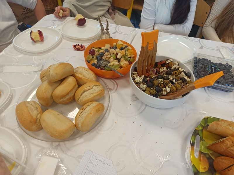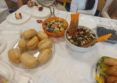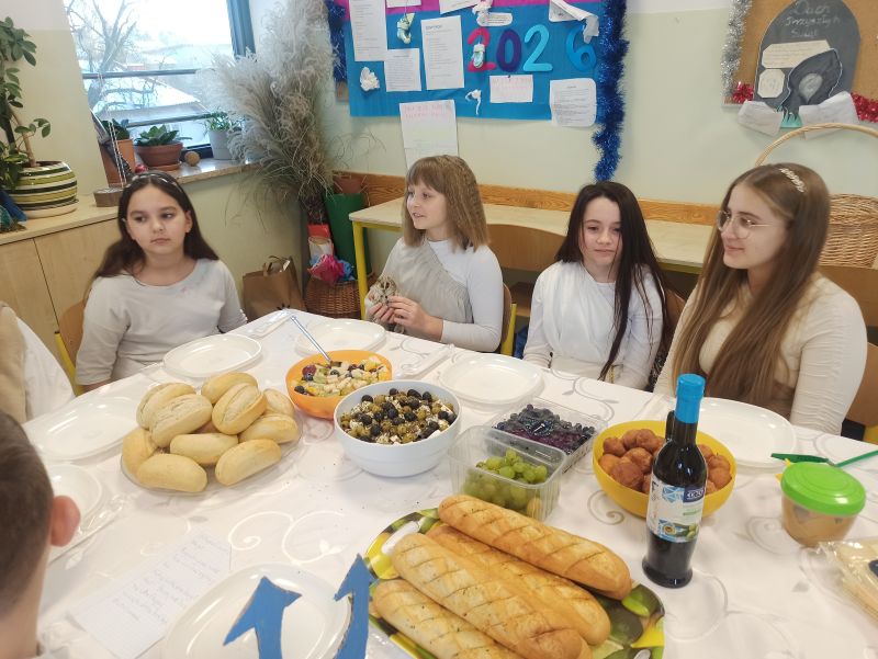 Prawdziwą wisienką na torcie był jednak stół pełen pyszności inspirowanych kuchnią grecką. Dzięki ogromnemu wsparciu i życzliwości rodziców uczniowie mogli spróbować m.in. oliwek, serów, sałatek i innych smakołyków, które idealnie dopełniły klimat spotkania.