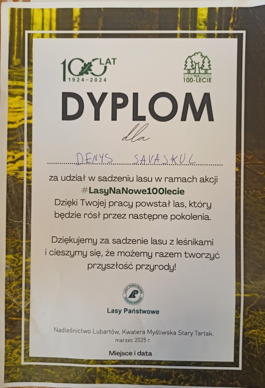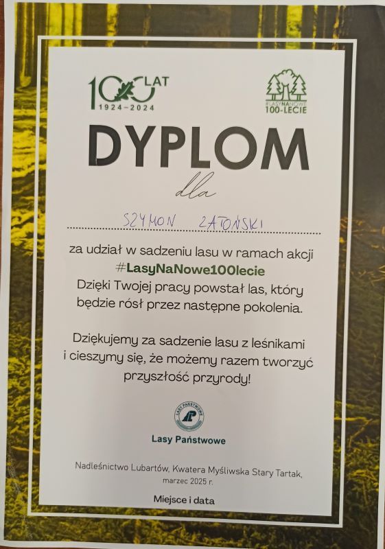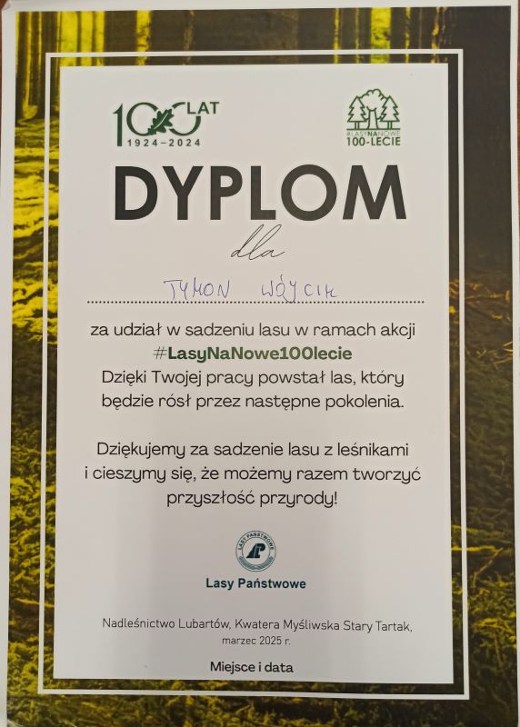 W tę szlachetną akcję włączyli się uczniowie klasy 7b: Denys Savaskul, Tymon Wójcik i Szymon Zatoński. Spędzili niedzielę wraz z innymi wolontariuszami, sadząc młody las. Jest to postawa godna naśladowania. Może w przyszłym roku do chłopców z 7b dołączą kolejni uczniowie?